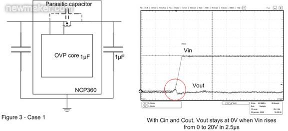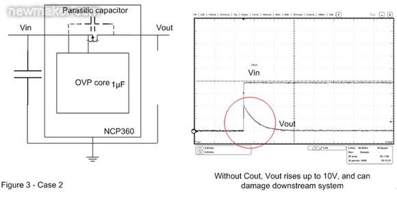 在圖3的案例2中,輸出電容已被移除。這樣,當OVP器件輸入端出現快速輸入瞬態現象時,旁路元件將保持開路。這時可以在輸出端觀察到過衝,這個過衝可能會損壞連接至OVP輸出端的電子元器件。為了解決這個問題,必須在輸出引腳上連接一個輸出電容,並盡量靠近OVP 器件擺放。