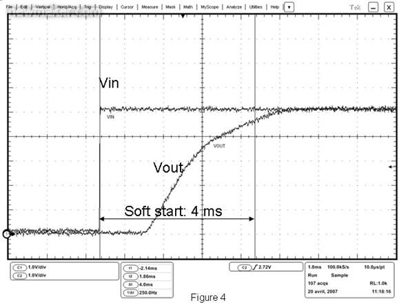正如“電氣特性和防護措施”小節所述那樣,浪湧電流是造成器件電氣損壞的根源之一,需要采用OVP器件來克服這一問題。為了避免任何類型的浪湧行為,OVP器件中通常都包含了軟啟動順序。這個特殊順序貫穿於PFet門的逐漸上升過程中,見圖4。