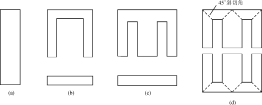 疊片式鐵心是把矽鋼帶材通過剪切或衝壓成鐵心片,然後疊裝成一定結構形式的鐵心。從鐵心片形狀發展來看(圖1),最早是單I形,後來是CI形、EI形和EExing,qimudeshibianyudiezhuang,jianshaogongshi。ruguocailiaoshiquxiangguigangdai,yaozhuyishiciluzhongcilixianfangxiangyuguigangquxiangyizhi,buyaoyuguigangquxiangchuizhi,fouzehuizengjiatiexinjicinenglianghetiexinsunhao。weilejiejuezhuanjiaochucilixianfangxiangbuyuguigangquxiangchuizhi,houlaiyoufazhancheng45°斜切角形片形。