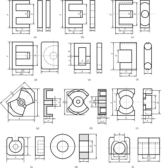 軟磁鐵氧體的鐵心結構比較多,這是由於采用熱壓工藝,比較容易加工成各種形狀。有EI、EE、EER、EP、UF、UYF、RM、PM、PQ、Q(罐形)、T(環形)和LP形等等(圖8)。EI形以尺寸A(E形鐵心寬度)為標誌,EE形以尺寸A(E形鐵心寬度)和2×B(E形鐵心長度)為標誌,已形成EI10~50,EE8.3/8.0~110/80係xi列lie,品pin種zhong多duo,製zhi造zao工gong藝yi簡jian單dan成cheng熟shu,散san熱re好hao,便bian於yu引yin出chu接jie線xian,成cheng本ben較jiao低di。缺que點dian是shi鐵tie心xin中zhong間jian柱zhu截jie麵mian為wei方fang形xing,給gei線xian圈quan繞rao製zhi帶dai來lai麻ma煩fan。同tong時shi,無wu屏ping蔽bi,容rong易yi產chan生sheng雜za散san磁ci場chang幹gan擾rao。EER形也是以尺寸A(E形鐵心寬度)和2×B(E形鐵心長度)為標誌,已形成EER25/33~54/50係列,鐵心中間柱截麵為圓形,繞線比較方便,同時繞線長度比方形截麵縮短11%,從而降低銅損。