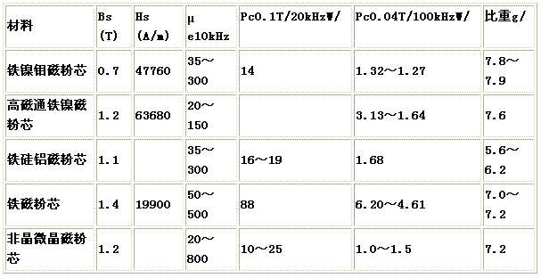 對磁粉芯提出的指標有飽和磁通密度Bs、有效磁導率μe、有效品質因數Qe、有效磁導率溫度係αμe及居裏點、比重等。主要的磁粉芯的性能參數如表1所示。鐵鎳鉬磁粉芯國家標準型號為FN81,上海鋼鐵研究所型號為SN,美國阿諾德公司型號為MPP,磁導率高,工作環境適應範圍廣,損耗低,但價格貴。鐵鎳高磁通磁粉芯國家標準型號為FN50,美國阿諾德公司型號為HF,飽和磁通密度高,磁導率中等,損耗也較低,價格較便宜,國內外最近比較重視研究和使用。鐵矽鋁磁粉芯上海鋼鐵研究所型號為SA,美國阿諾德公司型號為MS,是一種價格較低,綜合性能指標較好的磁粉芯。鐵磁粉芯上海鋼鐵研究所型號SF,國外一般型號為IP,磁導率和飽和磁通密度高,但在高頻下損耗大,隻適用於低頻和20kHz以下的中頻使用。由於價格便宜,可以把它加工成大型磁粉芯,代替矽鋼,作為大容量直流電源的濾波電抗器。