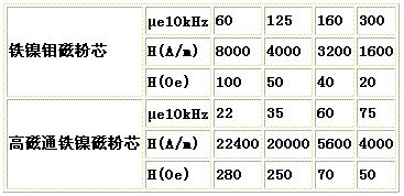 表2鐵鎳鉬磁粉芯和高磁通鐵鎳磁粉芯恒磁範圍