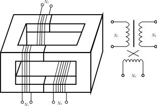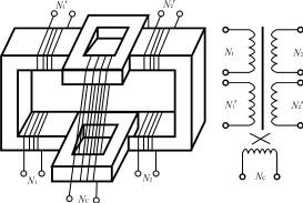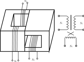 從20世紀80年代末開始,對由垂直形鐵心構成的立體布置的多功能鐵心結構進行研究的人員越來越多。最早是有人把C形鐵心的一半轉90°而形成的,發現在沒轉90°的C形鐵心上的繞組之間仍存在變壓器功能,轉90°的C形鐵心上繞上一個繞組,可以通過電流激磁後,改變沒轉90°的C形鐵心上繞組的電感〔見圖11(a)〕。後來把鐵心去掉一些變成圖11(b),仍然具有這樣的功能。圖11(c)是把兩個變壓器和兩個可控電感組合在一起的多功能鐵心結構。