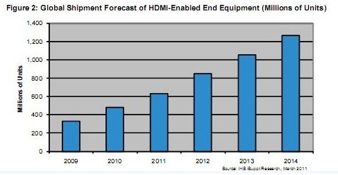 據IHS iSuppli公司的研究,液晶電視和其它高級數字設備的事實性連接標準HDMI,將被2011年出現的將近6.3億個消費電子產品采用,充當主要的設備接口,盡管在中國麵臨另外一種標準的挑戰。