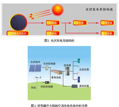 太陽能交流發電係統是由光伏組件、光伏控製器、蓄電池組和逆變器共同組成(如圖1),,其中,逆變器是最重要的部分。逆變器是一種電源轉換裝置,其主要功能是將蓄電池的直流電逆變成交流電,圖2表示了逆變器在太陽能交流發電係統中的作用。
