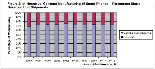 自有品牌智能手機OEM廠商,如蘋果和Research in MotiON (RIM),目前僅利用合同製造商提供EMS服務。RIM和蘋果2010年出貨量與市場份額都取得增長,利益於合同製造商的支持。