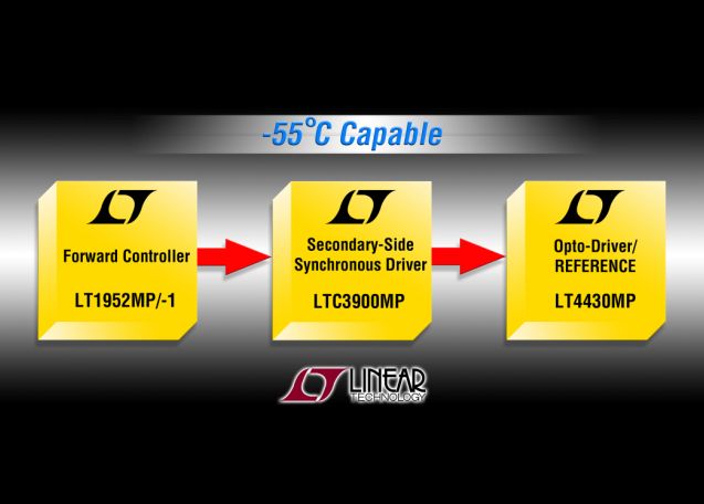 淩力爾特公司 (Linear Technology Corporation) 推出 LT1952/-1、LTC3900 和 LT4430 的高可靠性 (MP 級) 版本。這些器件合起來構成一個高效率 (高達 95%) 同步整流隔離式正向轉換器,該轉換器規定在 -55°C 至 125°C 的節溫範圍內工作,並在這個溫度範圍內進行了生產測試。LT1952/-1 是一款具有源變壓器複位功能的單開關正激式控製器,可向副端的 LTC3900 同步整流驅動器提供定時信號。LT4430 是一個具精準基準電壓的副端光驅動器,構成了嚴格調節的隔離型正激式轉換器電路。LTC3900 和 LT4430 的最高工作節溫規定為 150°C。這種類型的正向轉換器設計非常適用於 12V、24V 和 48V 標稱輸入電壓,這類輸入電壓常見於電信、數據通信、工業和軍事 / 航天應用。