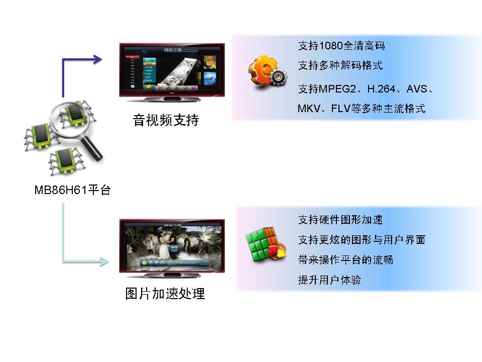而在這期間,由廣電係統主導的高清數字電視整轉正在深圳、北京、上海等發達地區悄然啟動,正在揭開一個龐大的高清機頂盒市場。目前包括富士通半導體、意法半導體、博bo通tong等deng眾zhong多duo廠chang商shang都dou加jia大da對dui高gao清qing機ji頂ding盒he市shi場chang的de營ying銷xiao力li度du,一yi場chang高gao清qing市shi場chang爭zheng奪duo戰zhan大da有you山shan雨yu欲yu來lai之zhi勢shi。其qi中zhong富fu士shi通tong在zai去qu年nian推tui出chu第di二er款kuan高gao清qing機ji頂ding盒he方fang案anMB86H61之zhi後hou,近jin日ri更geng與yu在zai國guo內nei廣guang電dian係xi統tong中zhong具ju有you廣guang泛fan業ye務wu合he作zuo的de領ling先xian數shu字zi電dian視shi業ye務wu平ping台tai及ji應ying用yong軟ruan件jian提ti供gong商shang深shen圳zhen茁zhuo壯zhuang網wang絡luo股gu份fen有you限xian公gong司si強qiang強qiang合he作zuo,推tui出chu基ji於yu富fu士shi通tong半ban導dao體ti高gao性xing價jia比bi雙shuang向xiang高gao清qing芯xin片pianMB86H61和茁壯網絡業界領先的iPanel3.0中間件平台的一體化定製解決方案,兩強發力欲坐實中國高清整轉市場。
