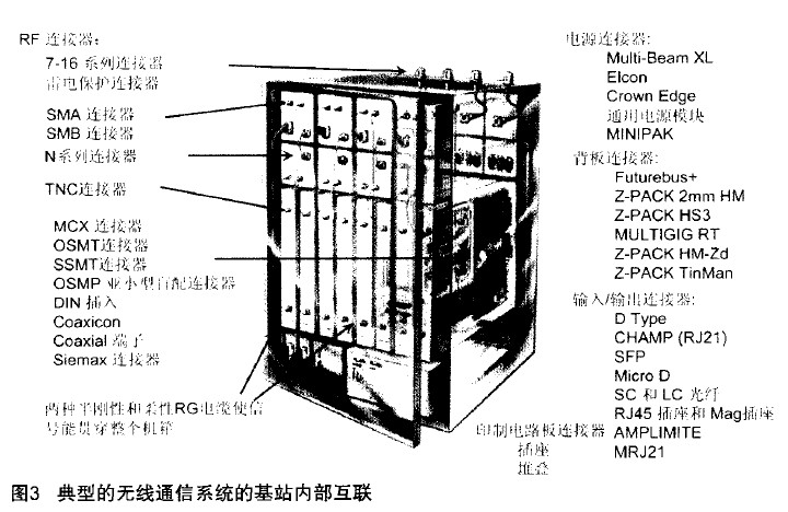 圖3biaoshideshidianxingdewuxiantongxinxitongdejizhanneibuhulian,yijitasuoxuyaodegezhonggeyangdedianzilianjieqi。congtuzhongkeyikanchu,zuobianjizhansuoyaoqiudedoushishepinlianjieqi,youbianbiaoshideshidianyuanlianjieqi、背板連接器、輸入/輸出連接器和印製電路板連接器。