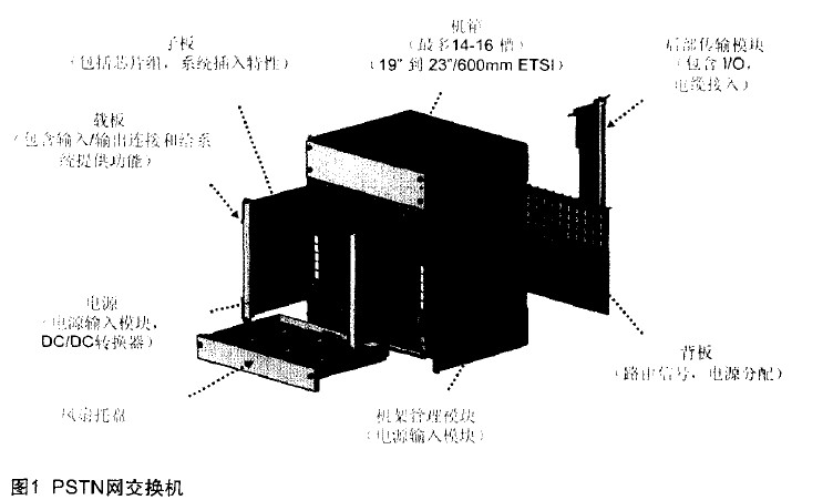 圖1所示為一個PSTN網的交換機,該交換機由7個部分組成。除了機箱尺寸的區別,機箱底部是一個機架的管理模塊,它包括管理模塊、傳輸背板和傳輸模塊。最前麵有子板、載板、電源板,以及風冷係統、電扇托板。在交換機中,它的主要載板就是電話信息的傳輸以及輸入/輸出的連接,輸入,輸出係統所組成的隻有很少的電腦板以及信令控製板。