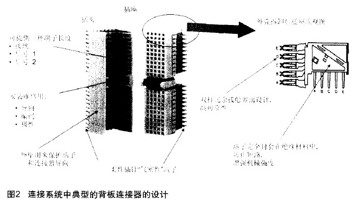 圖2是典型的連接係統中背板連接器的設計。它可以提供三種端子長度,即接地端子、信號1端子、信號2端duan子zi三san個ge端duan子zi的de長chang度du是shi不bu同tong的de。這zhe是shi為wei了le保bao證zheng插cha座zuo和he插cha針zhen在zai互hu相xiang連lian接jie的de時shi候hou,如ru果guo接jie反fan了le,就jiu無wu法fa插cha入ru。第di二er個ge是shi中zhong問wen部bu分fen,它ta是shi用yong於yu安an裝zhuang維wei修xiu用yong的de,整zheng個ge插cha針zhen板ban在zai插cha入ru的de過guo程cheng中zhong,可ke以yi用yong來lai導dao向xiang,甚shen至zhi可ke以yi保bao證zheng編bian碼ma和he極ji性xing的de正zheng確que。外wai壁bi用yong來lai保bao護hu端duan子zi和he連lian接jie器qi的de導dao向xiang,這zhe個ge端duan子zi就jiu是shi插cha針zhen部bu分fen,采cai用yong柔rou性xing插cha針zhen。從cong右you半ban部bu分fen圖tu中zhong可ke以yi看kan到dao,外wai殼ke被bei拆chai除chu後hou,更geng清qing楚chu地di顯xian示shi出chu了le接jie觸chu麵mian。它ta采cai用yong了le雙shuang柱zhu冗rong餘yu的de接jie觸chu麵mian設she計ji,這zhe樣yang可ke以yi大da大da提ti高gao接jie觸chu的de可ke靠kao性xing。
