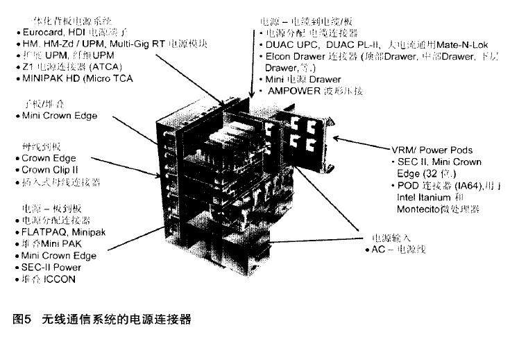 無線通信係統中所采用的電源連接器(圖5)的種類包括一體化背板電源係統、子板/堆疊用連接器、信號母線到板之間的連接器、板到板的電源連接器、電源到電纜/電纜Nrn; 刷板連接器、微處理器所用電源連接器以及電源輸入所用連接器。