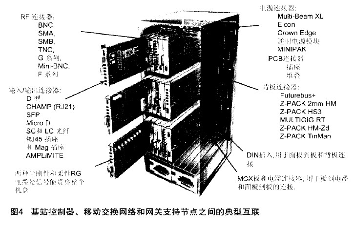圖4表示的是基站控製器、移動交換網絡和網關支持節點之間的典型互聯。這些互聯也用到了多種連接器。