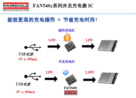 FAN5400係列電池充電器IC使用高集成度開關模式充電器,以便最大限度地縮短從USB電源為單節鋰離子(Li-Ion)電池充電的時間,並使用升壓調節器從電池為USB外設供電。由於充電電流和電池容量繼續增加,使用線性充電器通過USB端口或5V AC/DC適配器進行充電的效率變得越來越低,FAN5400的開關模式充電器能夠提供高達94%的效率,有助於加快充電速度並減少熱耗散。