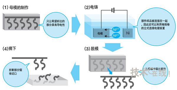 電鑄並不是一項新技術。這項技術開發於19世紀30年代,近年廣泛用於製造光盤模片的“模具”,以及接觸探針銷(Contact Probe Pin)和噴墨噴嘴(Inkjet Nozzle)等“部件”。此次開發的焦點是,史無先例地在連接器觸點中采用電鑄,由此“實現了不可能完成的加工”。