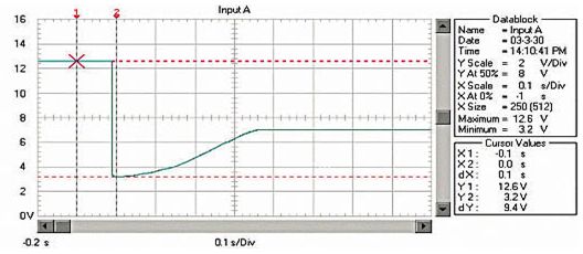 由於RM、RB、RL均非常低,啟動電流非 常大。例如用12V、45Ah的蓄電池啟動安裝1.9升柴油機的汽車,蓄電池的電壓在啟動瞬間由12.6V降到約3.6V!啟動過程的蓄電池電壓波形如圖 1;啟動瞬時的電流達550A,約為蓄電池的12C的放電率!啟動過程的蓄電池電流波形如圖2,(電流傳感器的電流/電壓變換比率:100A/V)。盡管 車用蓄電池是啟動專用蓄電池,可以高倍率放電,但在圖1中可以看出,10倍以上的高倍率放電時的蓄電池性能變得很差,而且,如此高倍率放電對蓄電池的損傷 也是非常明顯的。啟動過程的電壓劇烈變化也是極強的電磁幹擾,可以造成電氣設備的“掉電”,poshidianqishebeizaifadianjiqidongguochengjieshuhouzhongxinshangdian,jisuanjizaizhegeguochengzhongfeichangrongyisiji。yinci,wulunconggaishanqichedianqishebeidediancihuanjinghaishigaishanqichedeqidongxingnenghexudianchidexingneng、延長使用壽命來考慮,改善汽車電源在啟動過程的性能是必要的。