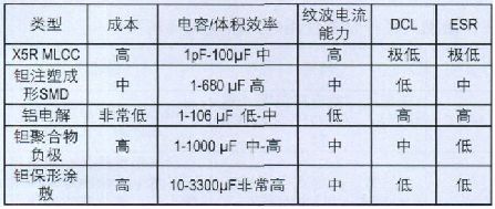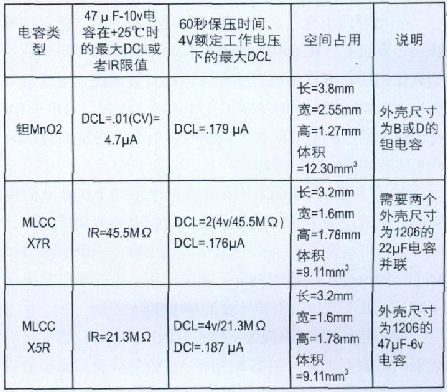 MLCC具有良好的低DCL特性,但在某些情況下,鉭電容能夠以更小的體積提供同樣低的DCL.表5 比較說明了根據DCL要求正確評估和選擇合適的電容的計算方法。如表5所示,鉭電容一般按照DCL最大值來確定規格。標準二氧化錳 (MnO2)構造的鉭電容在生產廠家處是按照 (。01xCV) 進行分級的。某些電容生產廠家還會隨DCL信息提供具體的保壓時間,並且根據比同級別的DCL最大值低得多的具體DCL限值進行電容器的預篩選。