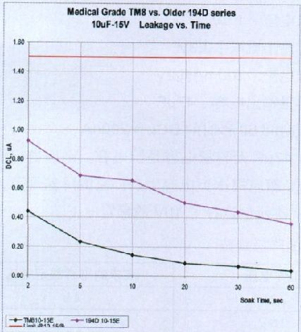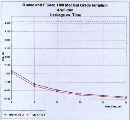 圖10對F外殼尺寸的194D係列設計與TM8係列設計進行了比較。194D是一種用於眾多高可靠應用中的老式設計。鉭芯設計采用高-k CV粉末,為23kCV.而 TM8 是一種較新的醫用級設計,使用10Kvc粉末,大幅度改善了DCL性能,而且采用的最新 MAP 裝配工藝,不會增加板級空間占用。