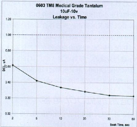 在便攜應用中,較長保壓時間(soak time)下的DCL是電容重要的指標。對於有具體規格和鉭芯設計的鉭電容,某個生產批次中的DCL分布是可以量化的。如果應用要求極低DCL,可以方便地從某個批次中自動篩選出某個額定電壓下具有特定DCL符合便攜式設備使用條件的鉭電容。