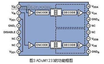 ADI公司的隔離門級驅動器係列產品采用iCoupler技術,其中雙通道 ADuM1233(圖3)提供了輸出通道和輸入通道之間的隔離以及兩個輸出通道之間的隔離,適用於IGBT控製通道的隔離。
