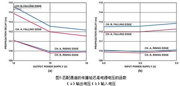 由於兩個通道之間的定時關係是十分重要的,而且PWM信號在反相階段驅動IGBT,因此與LED和光電二極管相比,iCoupler技術的速度、穩定性和可靠性是非常出色的。如圖5的曲線所示,在輸出電壓範圍為12 V~18 V,輸入電源電壓範圍為4.5 V~5.5 V的情況下,兩個通道的上升沿的傳播延遲是匹配的,約為100 ps,而且下降沿的傳播延遲優於1 ns。