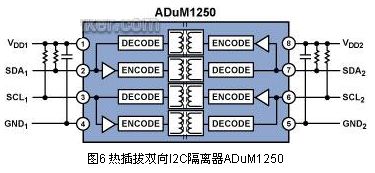 iCoupler技術實現的集成隔離解決方案以較低的成本降低了電路板尺寸要求和設計複雜度。圖6所示的ADuM1250和ADuM1251實現了真正的雙向隔離,並且集成了用於消除毛刺信號和鎖定的緩衝器。這種高度集成的解決方案僅需兩個旁路電容和兩對上拉電阻(I2C標準的規定),並且能夠以較低的成本提供I2C接口。有關這些器件的使用細節,請參考應用筆記AN-913“PC接口隔離”。