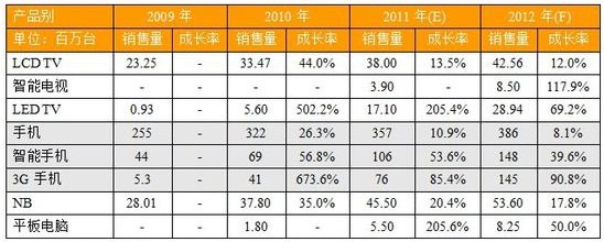中國大陸LCD TV、手機和NB三大指針性消費電子產品,拓墣預估2012年銷售量雖然分別成長12%、8.1%和17.8%,但卻較2011年的13.5%、10.9%、20.4%成長率遜色,更難與2010年nian的de高gao成cheng長chang相xiang提ti並bing論lun。顯xian示shi中zhong國guo大da陸lu內nei需xu市shi場chang已yi漸jian趨qu飽bao和he,超chao高gao成cheng長chang率lv很hen難nan再zai現xian。不bu過guo,中zhong國guo大da陸lu政zheng府fu加jia速su推tui展zhan三san網wang融rong合he的de策ce略lve,卻que使shi得de智zhi能neng電dian視shi、智能手機、3G手機和平板電腦等利基產品,表現相對亮眼。