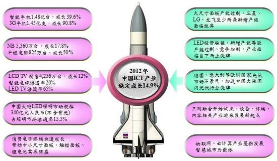 拓tuo墣墣產chan業ye研yan究jiu所suo上shang海hai子zi公gong司si研yan究jiu員yuan謝xie醫yi軍jun表biao示shi,過guo去qu中zhong國guo大da陸lu依yi靠kao出chu口kou導dao向xiang經jing濟ji以yi維wei持chi高gao度du成cheng長chang,歐ou美mei經jing濟ji不bu振zhen反fan而er讓rang內nei需xu市shi場chang成cheng為wei主zhu要yao成cheng長chang動dong能neng。而er智zhi能neng手shou機ji、智能電視和平板電腦等三大智能終端,在中國市場正處於快速成長期,以及十二五規劃對於ICT產業的政策支持,使得2012年中國大陸ICT產業將維持向上成長態勢,成長率預估為14.9%,產值可望突破10兆元人民幣。