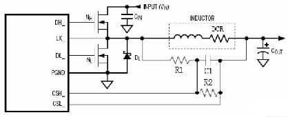 由you於yu輸shu出chu電dian壓ya低di,那na麼me電dian流liu比bi較jiao器qi的de兩liang個ge輸shu入ru管guan腳jiao的de共gong模mo電dian壓ya較jiao低di,因yin此ci可ke以yi使shi用yong低di輸shu入ru共gong模mo電dian壓ya的de差cha動dong放fang大da器qi,提ti高gao電dian流liu檢jian測ce的de精jing度du,降jiang低di噪zao聲sheng。這zhe種zhong配pei置zhi另ling一yi個ge大da的de優you點dian是shi可ke以yi使shi用yong電dian感gan的deDCR作為電流檢測電阻。要注意的是,在電感值和飽和電流滿足整個輸入電壓範圍和輸出負載電流範圍的前提下,對電感的DCR有一定的限製,因而在一些應用中需要定製電感。此外,電流比較器的輸入阻抗要大,兩個輸入管腳的偏置電流要小,從而提高使用DCR作為電流檢測電阻時的檢測精度。相關的濾波元件也在設計作相應的匹配,如下圖所示。