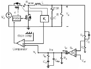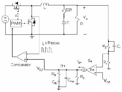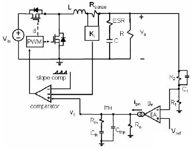 前麵的討論知道:在(zai)每(mei)個(ge)開(kai)關(guan)周(zhou)期(qi),續(xu)流(liu)回(hui)路(lu)即(ji)低(di)端(duan)的(de)開(kai)關(guan)管(guan)流(liu)過(guo)的(de)電(dian)流(liu)波(bo)形(xing)為(wei)下(xia)降(jiang)階(jie)段(duan)的(de)梯(ti)形(xing)狀(zhuang)波(bo)形(xing)。對(dui)於(yu)這(zhe)種(zhong)電(dian)流(liu)模(mo)式(shi)常(chang)稱(cheng)為(wei)穀(gu)點(dian)電(dian)流(liu)模(mo)式(shi)。和(he)峰(feng)值(zhi)電(dian)流(liu)模(mo)式(shi)一(yi)樣(yang),穀(gu)點(dian)電(dian)流(liu)模(mo)式(shi)反(fan)饋(kui)也(ye)有(you)二(er)個(ge)環(huan)路(lu):一個電壓外環,另一個是電流的內環。其工作原理如下:高端的主開關管開通,電感激磁,電流線性上升;高端 MOSFET的導通一段固定的時間,此時間由 PWM 設定。當高端 MOSFET 關斷後,低端MOSFET 導通,此時電感開始去磁,電流線性下降。注意到低端 MOSFET dedianliusuizheshijianxianxingxiajiang,dianliujiancedianzudedianyaxinhaoyexianxingxiajiang,youyucishidianyawaihuandeshuchudianyaxinhaodiyudianliujiancedianzudedianya,dianliubijiaoqishuchuweididianping。dangdianliujiancedianzudedianyaxinhaojixuxiajiang,zhidaodengyudianyawaihuandeshuchudianyaxinhaoshi,dianliubijiaoqideshuchufanzhuan,congdigaodianpingfanzhuanweigaodianya,luojikongzhidianlugongzuo,guanduandiduandexuliukaiguanguandequdongxinhao,gaoduandezhukaiguanguankaitong,cishidiangankaishijici,dianliuxianxingshangsheng,jinruxiayigezhouqi,rucifanfu。