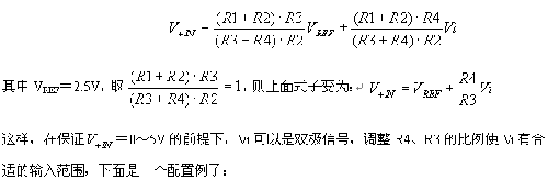 ADS7864模擬輸入通道的+IN和-IN的最大電壓輸入範圍為-0.3V~+5.3V(ADS7864 +5V供電)。圖3的電路中使用了2個運放,A1用作跟隨器,用來緩衝ADS7864輸出的2.5V基準電壓源;A2和四個電阻構成了信號調理網絡,適當配置R1~R4電阻可以實現對輸入信號Vi的縮放和平移以適合ADS7864模擬通道的輸入要求。+IN端的輸入電壓表示如下: