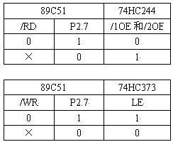係統采用89C51的P2.7尋址ADS7864,地址為8000H,同時用這個地址信號配合89C51的/WR和/RD信號作74HC244和74HC373的使能信號。要求當89C51的/RD=0,P2.7=1時才開啟74HC244,讀取ADS7864的轉換結果;當89C51的/WR=0,P2.7=1時74HC373才鎖存89C51 P0口上的數據信號,實現往ADS7864的控製端寫數據,其它時候74HC244和74HC373都是關閉的,這樣避免了89C51 P0口上的其它信號對ADS7864的幹擾。采用鎖存器74HC373來連接89C51和ADS7864的原因是為了在ADS7864轉換數據的時候保持/HOLDA~/HOLDC、A0~A2端的電平保持不變,免得影響ADS7864轉換數據的精度。74HC244和74HC373的使能信號真值表如下:
