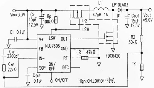最近廠家生產出了帶負載切斷功能的升壓型變換器IC,使用時采用圖1所示的電路。在待機時借助於P溝道MOSFET Tr2的截止,切斷輸入端和輸出端的直流通路。
