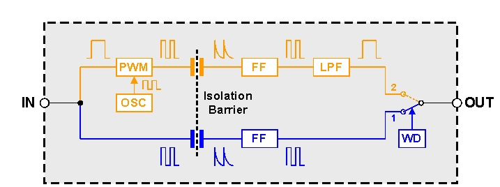 低速路徑比高速路徑多出幾個功能元件。因為低頻輸入信號要求隔離勢壘禁止采用大電容,所以輸入信號被用於對內部振蕩器(OSC)的載波頻率進行脈寬調製(PWM)。這就構成了一個非常高的頻率,能夠通過該電容勢壘。由於輸入得到了調製,因此必須在實際數據傳輸至輸出端以前使用低通濾波器(LPF)去除其中的高頻載波。
