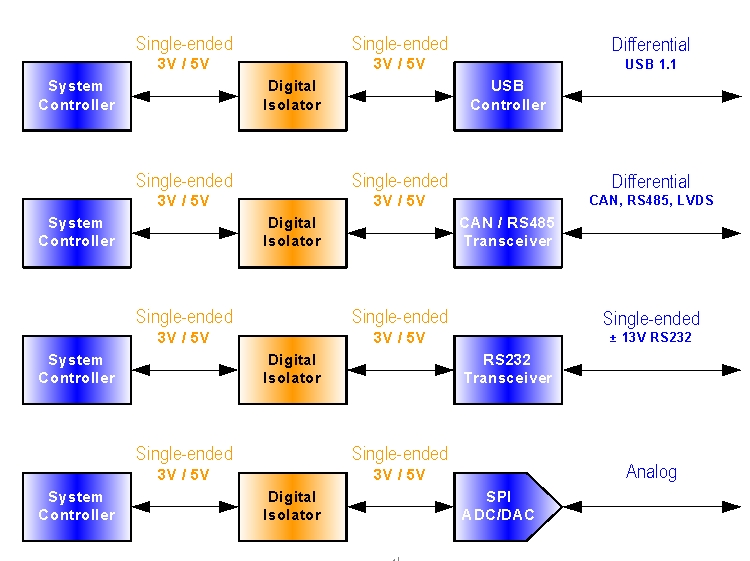 所有接口都有一個相同點,那就是數字隔離器必須安裝在隔離接口的單端3V/5V部分。