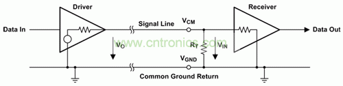 單端數據傳輸僅使用一條信號線,其電勢被看作接地。當信號線為信號電流提供正向通道時,接地線會提供回流通道。圖 1 顯示了單端傳輸通道的基本示意圖。