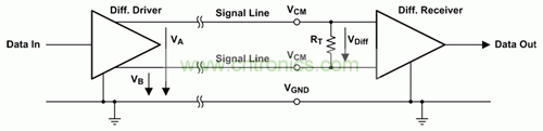 差動信號傳輸采用由兩條導線組成的信號線對:一條用於使電流正向流動,另一條用於使電流回流。每條信號導線都具有一個共模電壓 VCM,該電壓與 50% 的差動驅動器輸出電壓 VOD 相疊加,但彼此極性相反(請參見圖 2)。