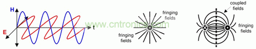 圖 3 從單導線周圍的大散射磁場和差動信號線對緊耦合導線回路之外的小散射磁場輻射出的 TEM 波