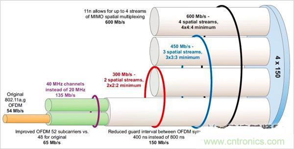搜各種百科資料IEEE802.11詞條,我們可以讀到,從802.11n開始,數據傳輸速率或者說承載的數據量有了很大的提升。首先,802.11n有了40MHz模式,然而按照之前的理論,它的發射範圍應該因此降低一半才對,但事實上數據反而提升了一倍(70m),這又是怎麼一回事?