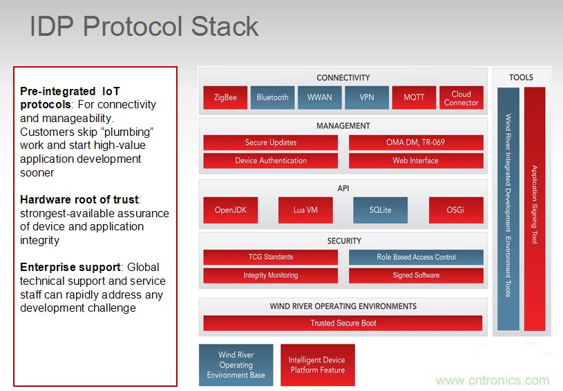 當下物聯網麵臨了三大挑戰:連接、安全以及管理(數據的管理與分析),此外還存在新舊設備交替的過渡期,而Gateway是讓傳統設備實現聯網的最佳方式(如電表),蘇建豪如是說。風河在Gateway中提供了IDP,是一個物聯網平台,廠商可以在上麵自己做開發,而不需要再下功夫去考慮連接、安全等問題,有效節省開發時間。