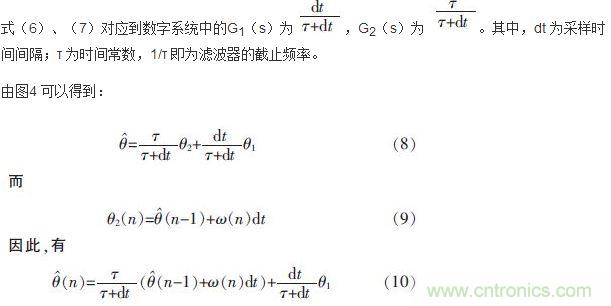 由(8)式可看出,在小於截止頻率的低頻段,加速度計對姿態解算結果起主要作用;在大於截止頻率的高頻段,陀螺儀對姿態解算結果起主要作用。通過調整時間常數,改變濾波器的截止頻率τ,實現對陀螺儀和加速度計權重的調整。