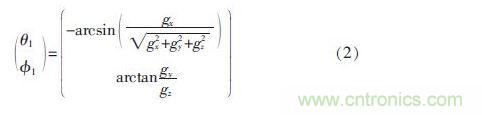 其中,Cbn為慣性坐標係到載體坐標係的變換矩陣;θ 為俯仰角;φ為橫滾角;g 為重力加速度; 可以通過測量重力加速度分量gx、gy、gz,計算出平衡車俯仰角θ1和橫滾角φ1估計值