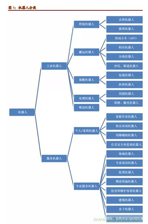 機ji器qi人ren專zhuan家jia從cong機ji器qi人ren應ying用yong環huan境jing出chu發fa,將jiang機ji器qi人ren分fen為wei兩liang大da類lei,即ji工gong業ye機ji器qi人ren和he服fu務wu機ji器qi人ren。工gong業ye機ji器qi人ren根gen據ju用yong途tu不bu同tong,大da致zhi可ke以yi分fen為wei焊han接jie機ji器qi人ren、搬運機器人、噴漆機器人、塗膠機器人、裝配機器人、碼垛機器人、切割機器人、自動牽引車(AGV)機器人、淨室機器人等。而服務機器人則是除工業機器人之外的、用於非製造業並服務於人類的各種先進機器人,主要包括個人/家用服務機器人和專業服務機器人。其中,個人/家用機器人主要包括:家庭作業機器人、娛樂休閑機器人、殘障輔助機器人、住宅安全和監視機器人等;專業服務機器人主要包括:場地機器人、專業清潔機器人、醫用機器人、物流用途機器人、檢查和維護保養機器人、建築機器人、水下機器人,以及國防、營救和安全應用機器人等等。