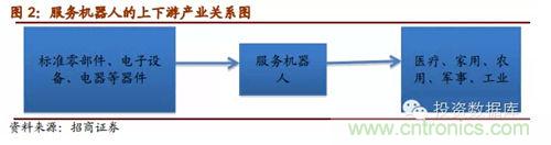 服務機器人行業生產所用的主要零部件為自動焊機、電子器件、微處理器、機器人用伺服電機、高精度減速器、機加件、氣動元器件、傳感器、電池、單板機等,歸屬於標準零部件、電子設備以及電子元器件等。服務機器人產業的下遊則主要是醫療、家用、農用、軍事等行業和領域。