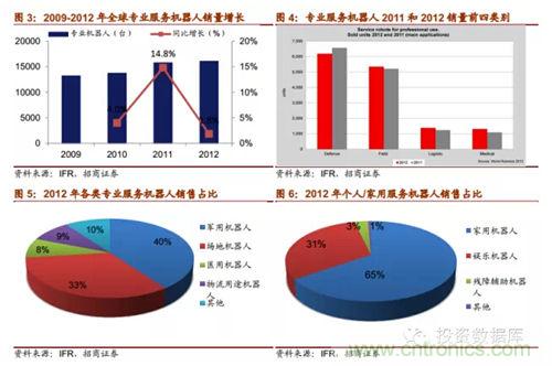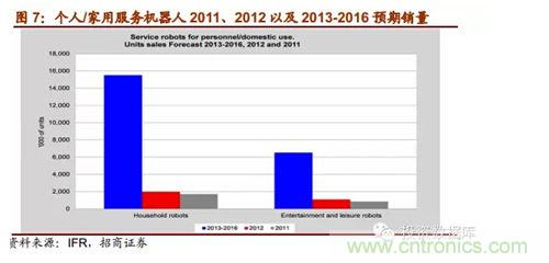 IFR報告預期,從2013年到2016年,全球工業機器人市場將以年均6%的速度增長,中國是這一增長趨勢的領跑者,年均增長率達15%。根據marketsandmarkets的報告,2011年全球服務機器人市場規模為183.9億美元,到2012年增長到207.3億美元,計2012-2017年全球服務機器人市場規模複合增速將達到17.4%,到2017年達到461.8億美元。對於專業服務機器,IFR預測2013-2016年估計有94800台專業服務機器人會得到安裝使用,銷售額達171億美元。其中軍用機器人銷量約達28000台;場地機器人中的擠奶機器人銷量估計為24500台。兩者占總專業服務機器人銷量55%。