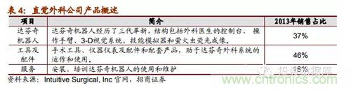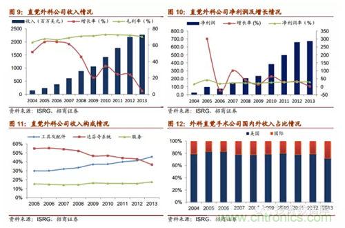 直覺外科公司是全球領先的微創機器人輔助手術機器人公司,2013年營收達22.65億美元,截止2014年第一季度達芬奇機器人累計銷售數量為3039台,2014年8月總市值達159.60億美元。