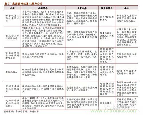隨著醫用機器人技術的不斷突破和發展,從2005年(nian)開(kai)始(shi)我(wo)國(guo)有(you)一(yi)批(pi)重(zhong)點(dian)高(gao)校(xiao)科(ke)研(yan)醫(yi)院(yuan)單(dan)位(wei)及(ji)研(yan)究(jiu)所(suo)在(zai)研(yan)究(jiu)醫(yi)用(yong)機(ji)器(qi)人(ren)係(xi)統(tong)並(bing)取(qu)得(de)了(le)一(yi)些(xie)小(xiao)成(cheng)就(jiu),比(bi)如(ru)哈(ha)工(gong)大(da)的(de)微(wei)創(chuang)腹(fu)腔(qiang)外(wai)科(ke)手(shou)術(shu)機(ji)器(qi)已(yi)經(jing)成(cheng)功(gong)被(bei)專(zhuan)家(jia)驗(yan)收(shou),天(tian)津(jin)大(da)學(xue)的(de)妙(miao)手(shou)機(ji)器(qi)人(ren)在(zai)今(jin)年(nian)3月份開始臨床使用;同tong時shi,隨sui著zhe醫yi用yong機ji器qi人ren商shang業ye化hua市shi場chang化hua的de可ke能neng性xing愈yu發fa明ming晰xi,已yi經jing有you部bu分fen企qi業ye正zheng在zai生sheng產chan或huo者zhe打da算suan進jin軍jun醫yi用yong機ji器qi人ren細xi分fen行xing業ye,其qi中zhong就jiu包bao括kuo機ji器qi人ren領ling先xian企qi業ye的de博bo實shi股gu份fen和he新xin鬆song機ji器qi人ren。