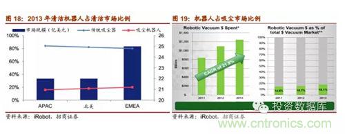 iRobot在家居清潔機器人市場上處於領先地位。2011年至2013年總清潔機器設備消費增長迅速,13年大於12億美元,而iRobot占市場的利率也逐年上漲,2013年達18.1%。iRobot在家居機器人行業中屬於龍頭領先企業並已經打通了全球銷售的網絡,在各大市場iRobot都遠遠領先於其它企業。2013年iRobot掃地機器人占北美市場比例為83%,占歐洲、中東及非洲市場(EMEA)62%,占環太平洋與日本市場(APAC)67%。2014年剛公布的半年報中,iRobot預計家用機器人全年銷售額同比增幅為18%-20%。
