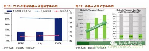 掃地機器市場具有巨大的潛力,增長勢頭強勁。13年家庭掃地機器人市場規模大於12億美元,過去三年複合增長率達21.8%。掃地機器人對傳統掃地設備的替代率不斷提高,13年占掃地設備市場18.1%。