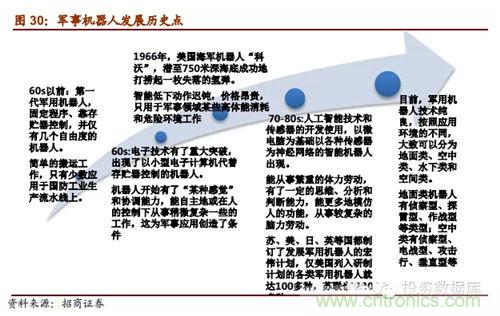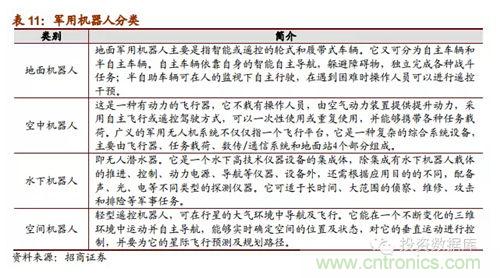 (五)軍事機器人是21世紀各國軍事安全重點戰略:蒂爾集團稱未來10年全球無人機研發投入和采購需求將達到940億美元。軍用機器人強國包括美德英法意以日韓,這些國家不僅在技術處於研究的先列,其產品已經在軍事上有了實際運用;我國與這些強國的技術差距明顯,受政策支持,軍事機器人相關企業發展前景明顯良好,可能成為企業未來強勁的收入保證。